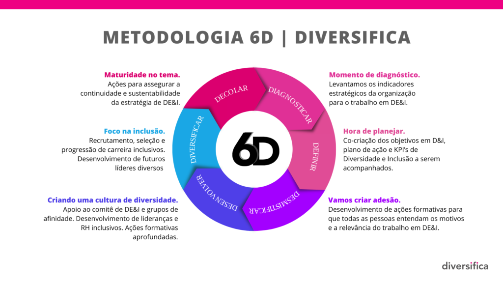 Para garantir consistência e efetividade, desenvolvemos a Metodologia 6D, que nos permite atuar em todas as etapas da jornada de diversidade e inclusão: do diagnóstico à prática inclusiva. Essa abordagem integrada assegura que cada ação esteja conectada a uma estratégia clara, com foco em transformação cultural e resultados mensuráveis.